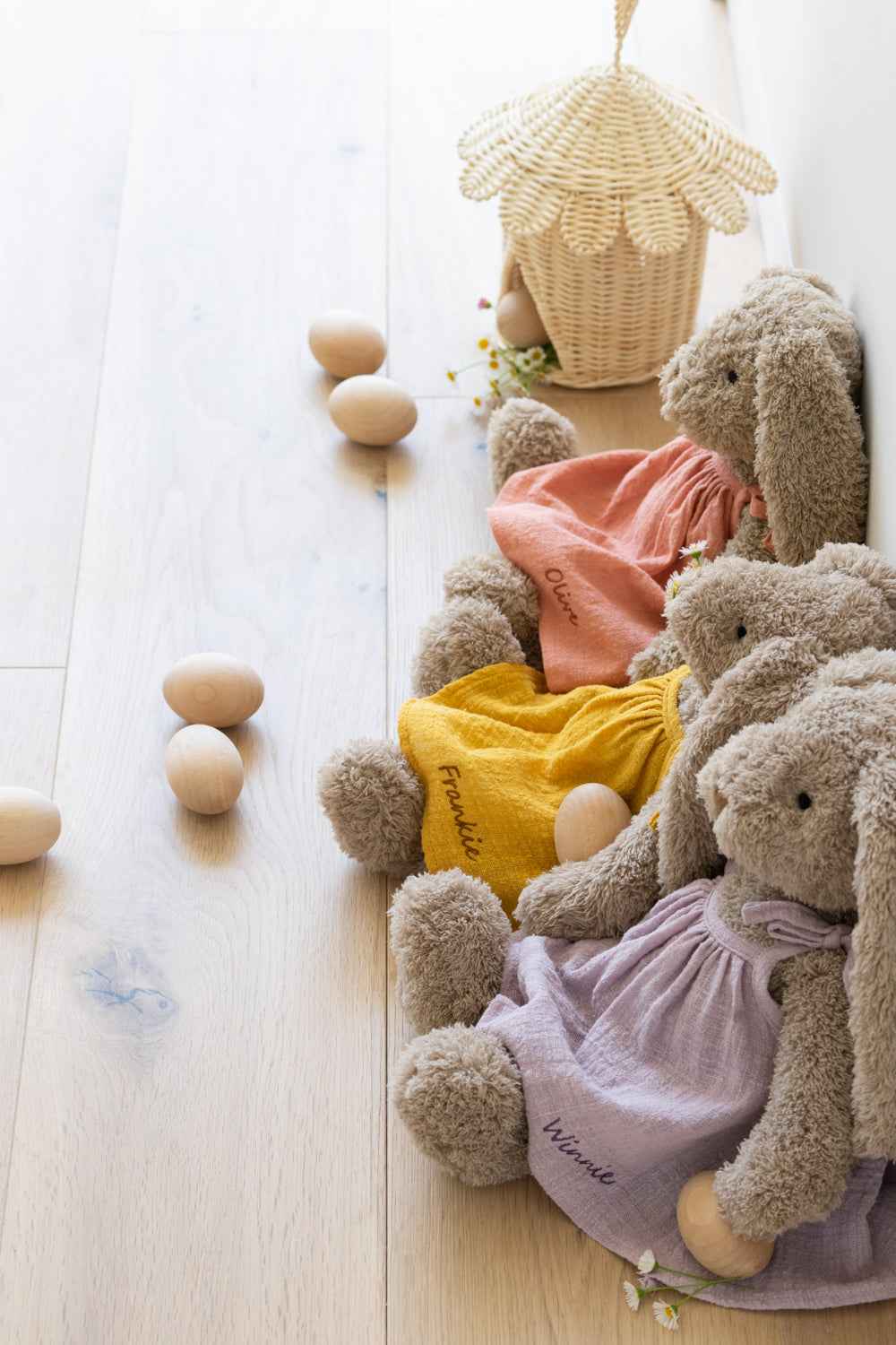 Order Mrs Honey Bunny & for no extra cost, we will embroider one name on her dress. Personalise your bunny with beautiful embroidery, crafted right here in Melbourne.