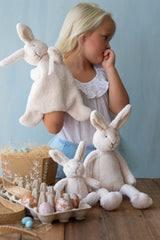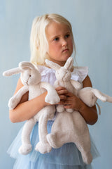 You know how Alice fell down the rabbit hole? Well, Bonnie fell up it. That's right. This cheeky soft toy rabbit was down in her burrow just munching carrots with the other bunnies when all of a sudden she bounced straight up & out into the middle of a suburban back garden. There were children running through a sprinkler at the time. Well, Bonnie's never looked back. Inquisitive, energetic & heaps of fun, Bonnie is a blessing just waiting to bounce into your little one's life.