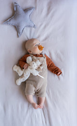 We take children’s safety very seriously & recommend that you refer to Red Nose Australia for information regarding safe sleeping practices for infants. It is recommended that there should be NO toys (or any other objects) left with a sleeping baby under seven months of age. The advice is “you can introduce a soft toy into your baby’s sleep environment once they are between seven to ten months of age” but "always remove the toys once baby has settled for sleep.”