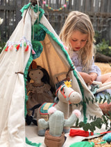 Being a Mama sometimes means improvising for camping ideas. You see, there's nothing Mama India's kids love better than pitching a tent, hosting a tea party, & hanging out with all their friends. Just as long as it is indoors, Mama India insists, because she is terrified of creepy crawlies. Rest assured, even if you encounter a scary spider, Mama will soothe you with the cuddliest bear hug of all the Nana Huchy dolls.