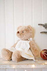 Order Honey Bear & for no extra cost, we will embroider a name on her dress in limited edition Xmas Gold thread. Personalise your teddy with beautiful embroidery, crafted right here in Melbourne.
