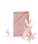 This carefully-curated bundle complete with a personalised baby blanket, Pixie the Bunny Hoochy Coochie puppet comforter, Pixie the Bunny pink rattle & Bonnie Bunny gift card is a unique & precious gift for a newborn.